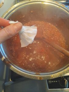 Ist die erste Garzeit vorüber, den gefüllten Teefilter dann mit dem Salz, Pfeffer, der Sojasauce und dem gehackten Peperoncino ins Hack einrühren und für weitere 10 Minuten köcheln.