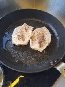 In einer beschichteten Pfanne einen Esslöffel Olivenöl erhitzen und erst wenn es wirklich heiß ist, die Schnitzel darin von beiden Seiten anbraten. Sobald sie gewendet wurden, mit einem Teelöffel Salz und einem halben Teelöffel Pfeffer würzen.