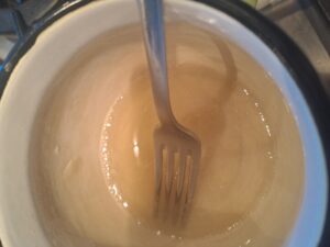 Für den Belag werden währen der Auskühlzeit des Biskuits die Gelatineblätter für 10 Minuten in kaltem Wasser eingeweicht. Somit weichen die Blätter auf und können ausgedrückt werden, um dann in einem kleinen Topf bei schwacher Hitze unter ständigem Rühren aufgelöst zu werden. Nicht aufkochen und sobald die Gelatine komplett aufgelöst ist, kurz abkühlen, jedoch nicht auskühlen lassen, da diese sonst wieder fest wird.