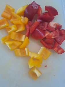 Die gelbe und rote Paprika in nicht zu kleine Scheiben schneiden. Die halbe Zucchini auch in nicht allzu kleine Würfel schneiden. Die Kartoffel in etwas kleinere Würfel als jene der Zucchini arbeiten und die Champignon lediglich putzen und waschen. Somit ist das Gemüse vorbereitet.