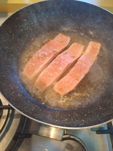 Die Lachsschnitten waschen, trockenen und entgräten (siehe 💡). Eine Pfanne mit dem Knoblauchöl erhitzen und die Lachsschnitten auf der Hautseite kräftig anbraten und dabei mit dem Zitronensalz würzen. Nach einigen Minuten, sobald der Fisch an der Seite leicht rosa wird, mit dem Saft der Zitrone beträufeln und mit drei Esslöffeln heißem Wasser aufgießen und alles kurz einkochen lassen. Vom Herd nehmen und noch ruhen lassen, während das Gemüse geschnitten wird.