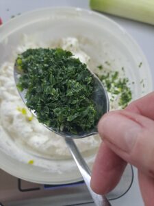 Nun das Frischkäsegemisch mit den Gewürzen, Lauch, Petersilie, Majoran und Kräutersalz verfeinern und am Ende die abgekühlte Zwiebel mit der Gabel gut verrühren. Fertig ist die Frischkäsefülle.
