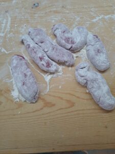Zuerst wird der Teigtaschenteig vorbereitet, damit dieser dann mindestens 1/2 Stunde ruhen kann. Dazu die Rohne in Stücke schneiden und mit dem Pürierstab pürieren. Die beiden Mehle mit den pürierten Rohnen vereinen und zusammen mit den Eiern, dem Olivenöl und dem Salz mit der Küchenmaschine zu einem glatten Teig kneten. Sollte er aufgrund der oft unterschiedlichen Eier nicht die richtige Konsistenz haben entweder noch etwas Mehl bzw. Wasser hinzugeben. Den Teig mindestens 3 Minuten in der Maschine kneten und dann in Klarsichtfolie eingewickelt ab in den Kühlschrank
