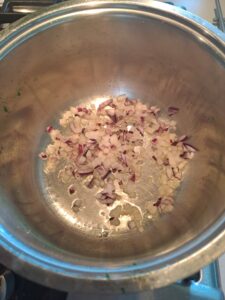 Den weißen und grünen Spargel schälen, die holzigen Enden abschneiden und in ungefähr 1 cm lange Stückchen schneiden. Auch die Zwiebel kleinhacken und diese in einem Topf mit heißem Olivenöl glasieren.